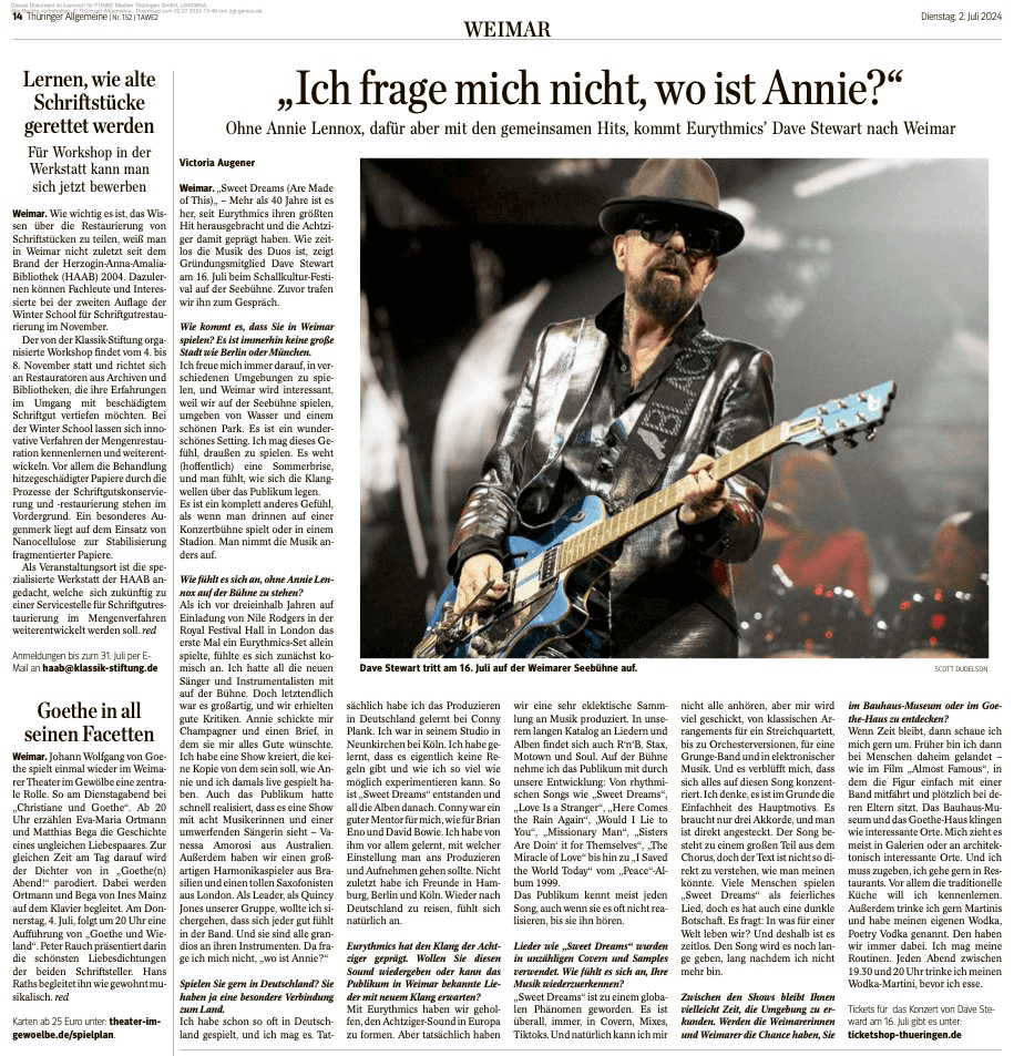 Eurythmics-Gitarrist live in Weimar: „Ich frage mich nicht, wo ist Annie?“ Victoria Augener, Thüringer Allgemeine (02.07.2024)
